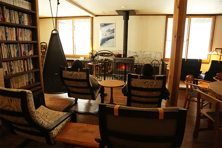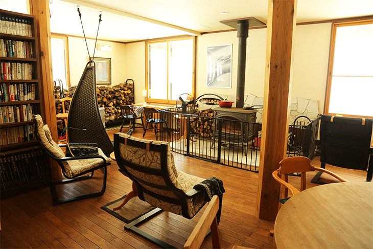 宿に入るとまず目に入るのが談話室だ。まるでオシャレなカフェに来たような、柔らかい空気に包まれる。アットホームな雰囲気に思わず腰を据えたくなる。薪ストーブの前にあるロッキンチェアーにいつまでも揺られていたくなるだろう。