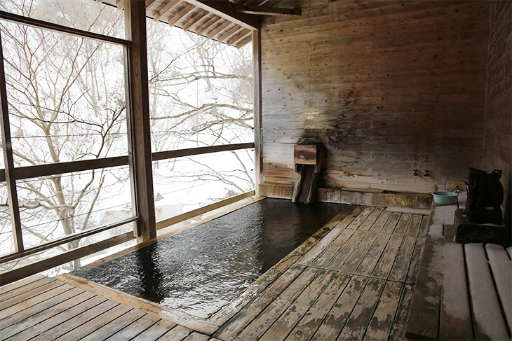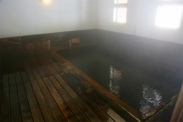 内風呂には二つの湯船があり、ぬる湯は38〜42度に設定されており、ゆっくりと入浴することができる。それに比べあつ湯は47度に設定されていて、とても浸かることができない。ではどうするのかというと、湯船の淵に寝そべり竹筒で湯をすくい胃腸付近にゆっくりとかける。それを100杯続けることが峩々温泉の伝統だという。ユニークなかけ湯だが、実際やってみると胃腸付近がポカポカと温まり代謝が良くなるのを感じる。このような伝統的な湯治文化を体感するのも峩々温泉の楽しみ方だ。