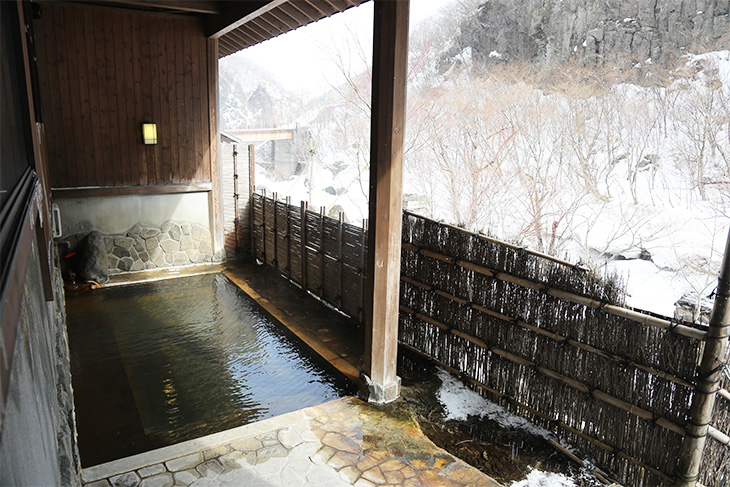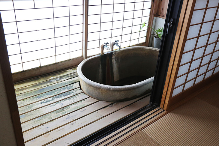 また部屋には浴槽もあり、蛇口をひねると源泉掛け流しの温泉が出てくるため、部屋から出なくても上質な温泉を堪能することができる。他の客と会わずにのんびりと過ごしたい人にはぴったりな部屋だ。この部屋は大人二人までの定員となっている。