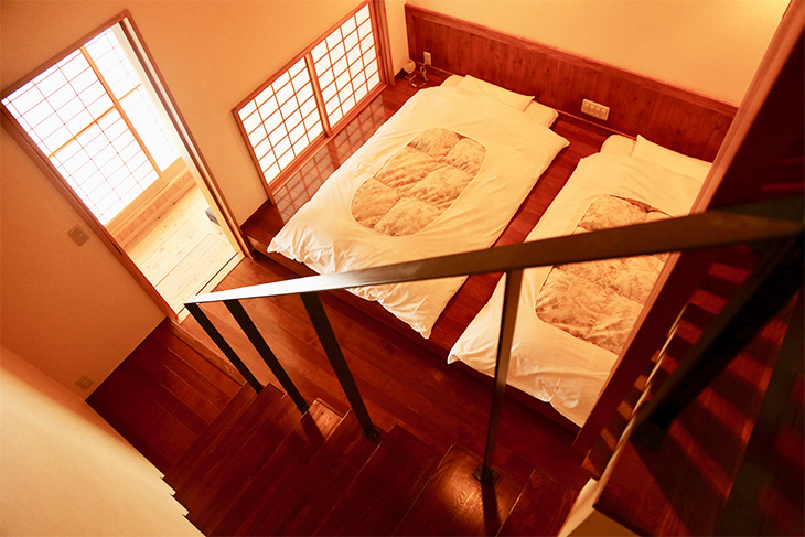 「こまくさ」はまるで別荘に来たかのような贅沢な部屋。この部屋にはミニダイニングやミニキッチン、パウダールームや茶の間。さらに隠れ部屋が和洋1つずつある。寝室にはロフトもあり、広々とした空間になっている。
