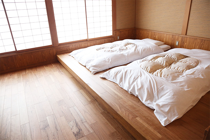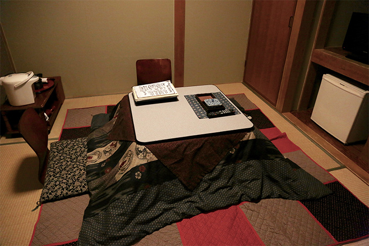 奥にある旅館でコタツを囲んで過ごす・・この上ない至福を感じる人もいるのでは?峩々温泉の客室は全て床暖房が完備されているため、厳冬期も足元や布団が暖かい。また布団は常に引いた状態になっており、これには滞在中に従業員が布団の出し入れに部屋に入ることもないので気兼ねなく過ごしていただきたい、という想いも込められているのだ。