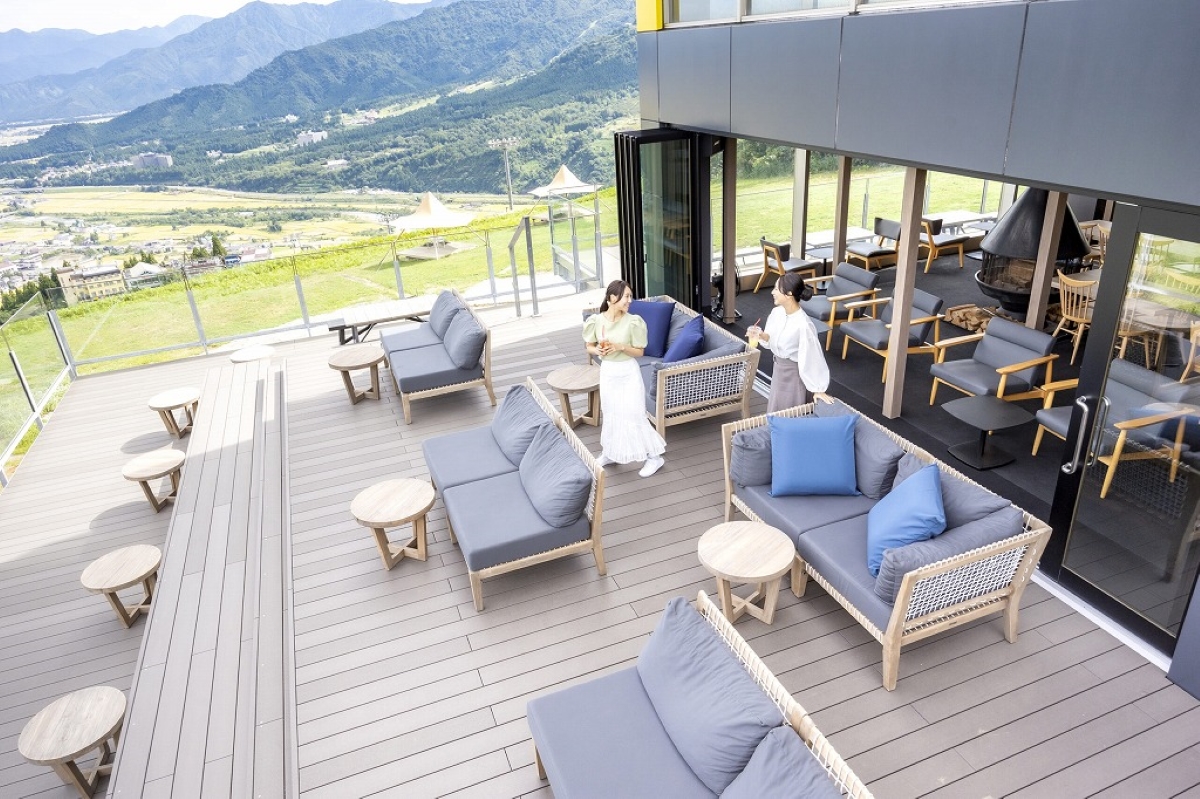 最初にご紹介したいのは、新潟県南魚沼市の石打丸山スキー場にある、2022年の夏より営業を開始した「ザ・ヴェランダ石打丸山」です。最新鋭のゴンドラ「サンライズエクスプレス」に乗って、絶景の空中散歩を楽しみながらテラスを目指しましょう。エリア最大級を誇る展望テラスからは、コシヒカリで有名な南魚沼の田園風景が眼下に広がり、目を上げると巻機山や越後三山など、越後の雄大な山並みを望むことができます。
