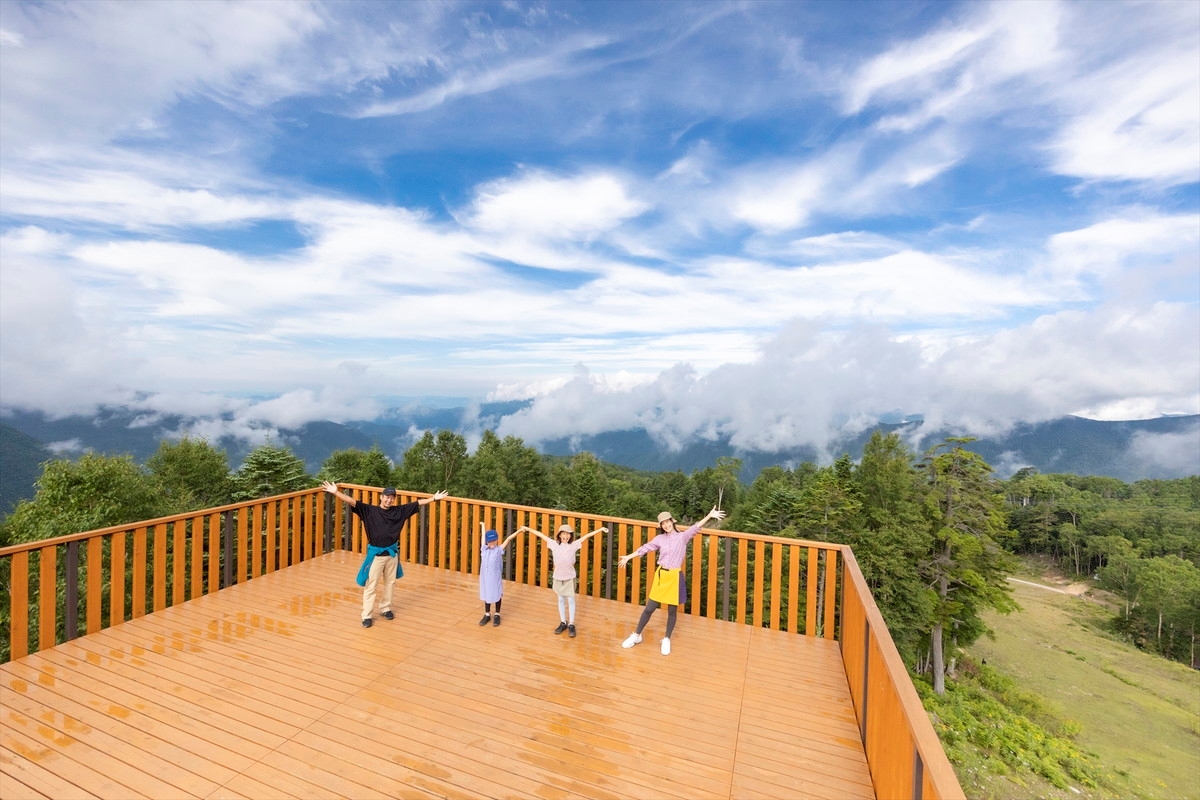 新潟県湯沢町にある日本有数のスノーリゾート、苗場スキー場。標高約1,500mに位置する「HOSHIZORAテラス」は、絶景を楽しみながら、暑い夏でも快適に過ごせる非日常な空間です。ホテル前の「HOSHIZORAゴンドラ」に乗り込み、ふわりと宙へ浮かぶと、眼下には静まり返った森と山の景色が広がります。天候が良ければ、夜空には星が輝いており、澄みわたる空気とともに星空観賞が楽しめます。