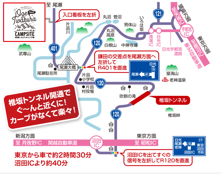 車関越自動車道沼田ICから国道120号→国道401号 約40分 |