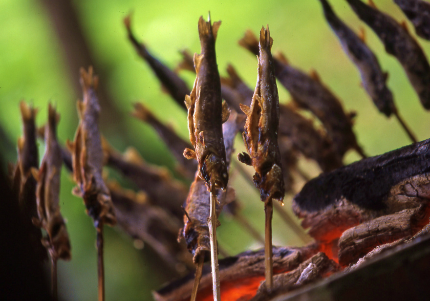 釣ったイワナは、炭火で焼きその場で食べられます。
