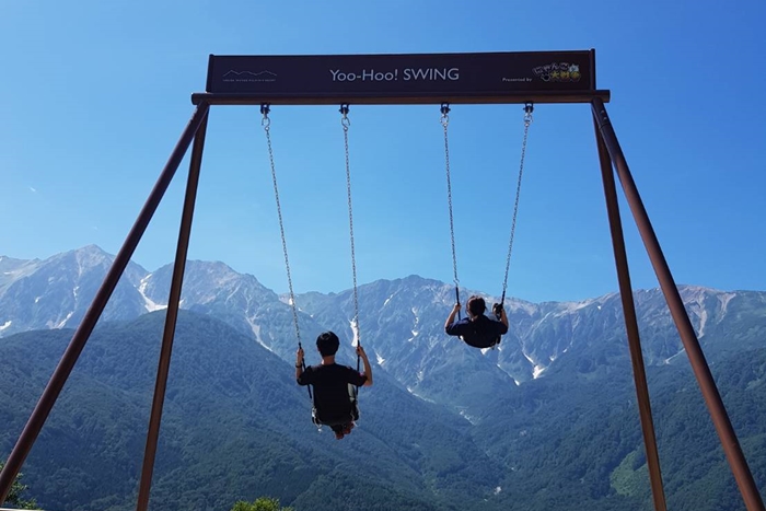 山頂エリアの北アルプス白馬三山を正面に見える場所に、雄大なアルプスに⾶びこむような感覚を楽しめる絶景大型ブランコ。まるでアニメの世界に入り込んだような体験は、この夏のオススメ。北アルプスをバックに爽快感のある写真スポットとしてもご利⽤いただけます。