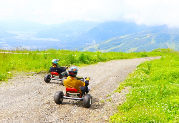エンジンがなく、⼭の上からハンドル操作とブレーキで⼭を駆け降りるスリリングなマウンテン・アクティビティです。低重⼼と広い幅のホイール、操作性の⾼いハンドルで、初⼼者でも安⼼安全に楽しめる設計になっています。