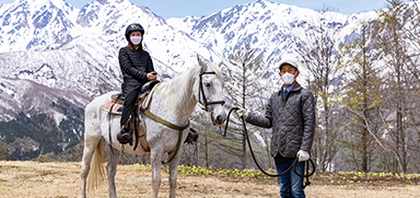 北アルプスを背景にひき馬やホーストレッキングを体験できる新アクティビティ。白馬にちなんで “白い馬”もいて、写真映えも間違いなし!馬上の揺れや高さを体験でき、揺れ心地とワクワクの高揚感で、思わず笑顔がこぼれます。