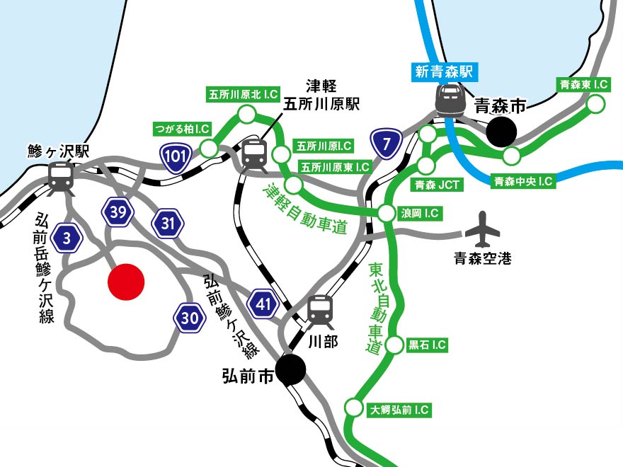 電車 | ●JR奥羽本線 弘前駅下車→タクシー40分 | |