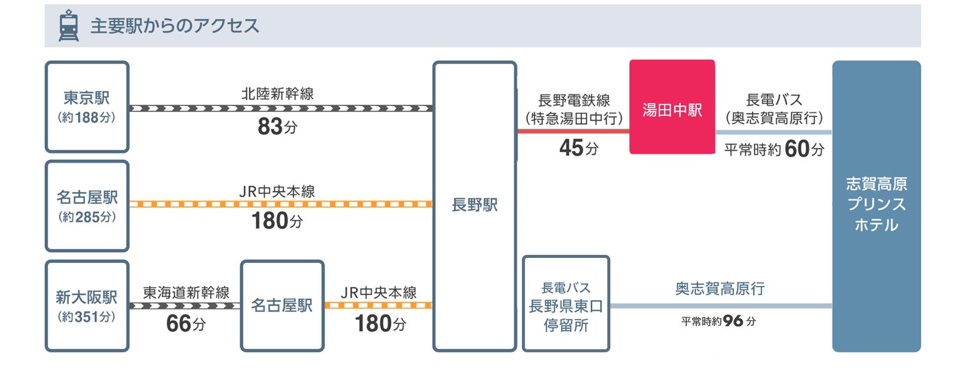 電車での移動志賀高原焼額山スキー場へは北陸新幹線「長野駅」から志賀高原急行バスでアクセス可能。約1時間40分で志賀高原エリアへ到着します。首都圏から新幹線利用で気軽に訪れることができます。 |