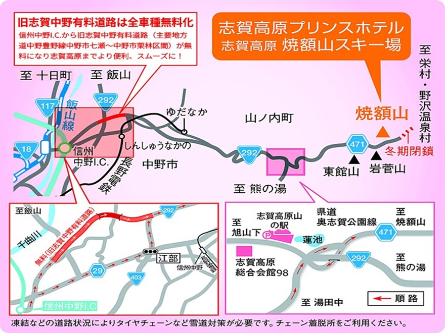 | 交通手段 | 車 | 上信越自動車道 信州中野I.C.より志賀高原方面へ。 国道292号線(オリンピック道路)経由で志賀高原焼額山スキー場まで約30km、約45分。 信州中野I.C. → 志賀中野有料道路(現在無料) → 国道292号線 → 志賀高原 → 焼額山スキー場 ※冬期は道路状況により所要時間が変動する場合があります。 積雪情報はこちら |