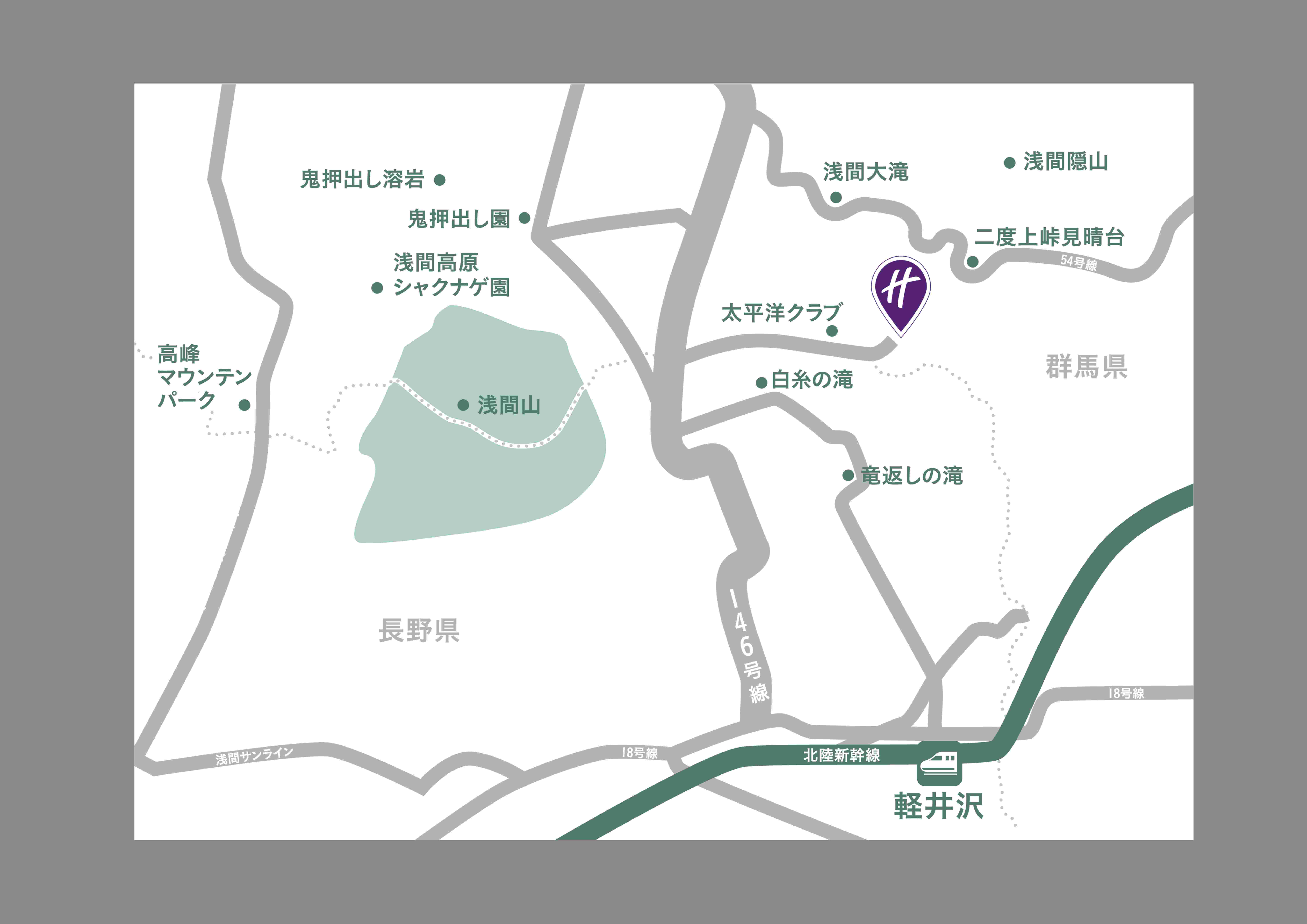 | 電車 | ●北陸新幹線 軽井沢駅下車→南口より無料シャトルバス ※無料シャトルバスは前日17:00まで要予約(0279-84-1227) |