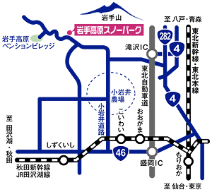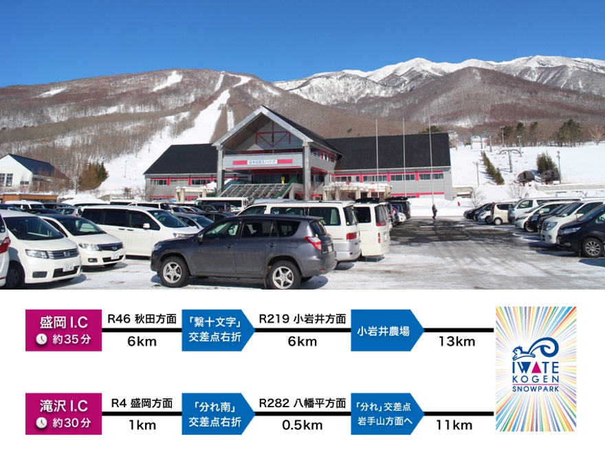 交通手段 | 車 | ●東北自動車道 盛岡IC→R46→小岩井道路→スキー場 約35分 積雪情報はこちら |
