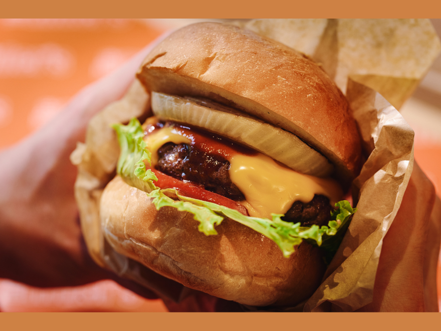 The Rider’sのシグネチャーメニュー 「The Rider's burger」。ジューシーなパテ、ベーコンでボリュームたっぷり。 ドリンク&ポテトセットがおススメ。