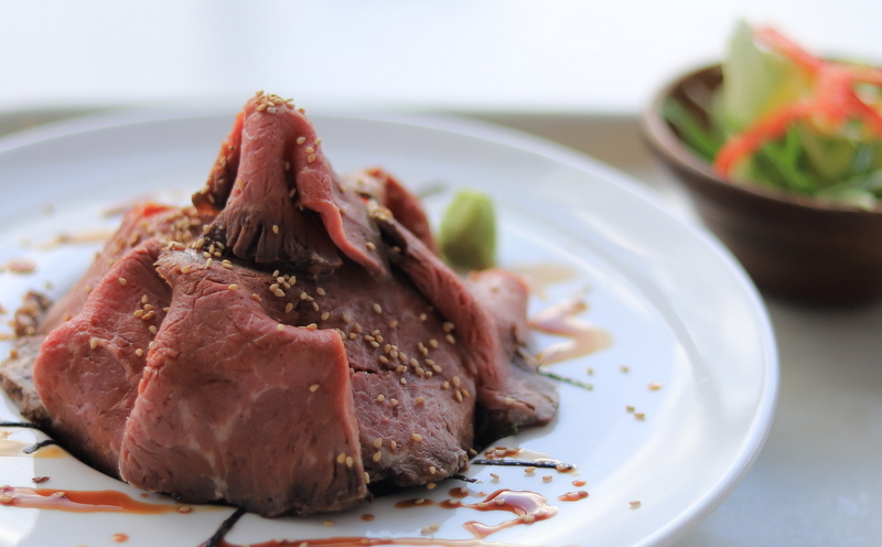 薄切りのローストビーフに特製のソースを振りかけ、海苔とゴマをトッピング。わさびとの相性も抜群です。