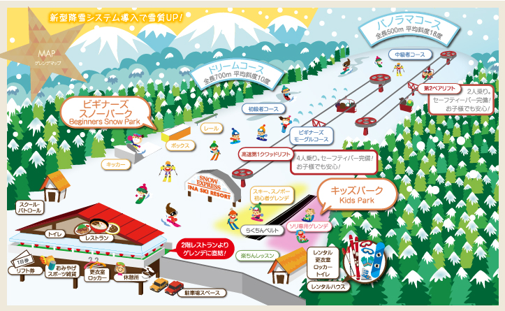 緩斜面でワイドなコース幅。初級者が気軽に楽しめます。 | |||||