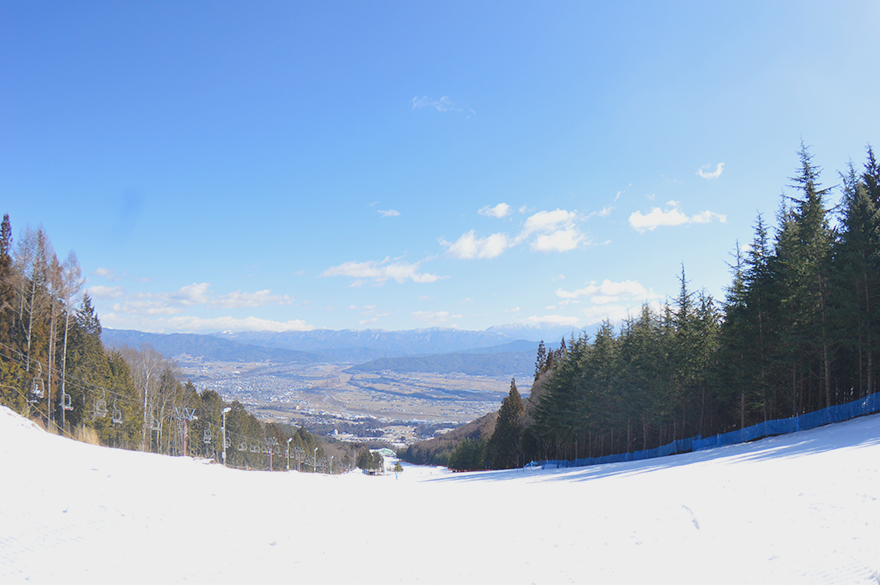 ゲレンデトップからの、南アルプス、伊那谷の眺めは絶景! 下のドリームコースと合わせ、1,200mのロングスロープを楽しめます。 |