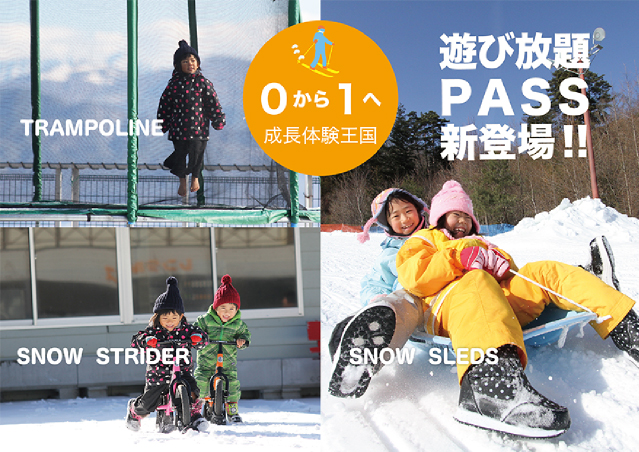 備考 | そりもトランポリンも思いっきり楽しんじゃおう!!小さな子供ちゃんでもたっぷりスキー場を楽しめますよ! 「遊び放題PASS」¥800-に含まれるもの ・ソリ ・スノーストライダー ・トランポリン ※楽ちんベルト券は含まれておりません。 |