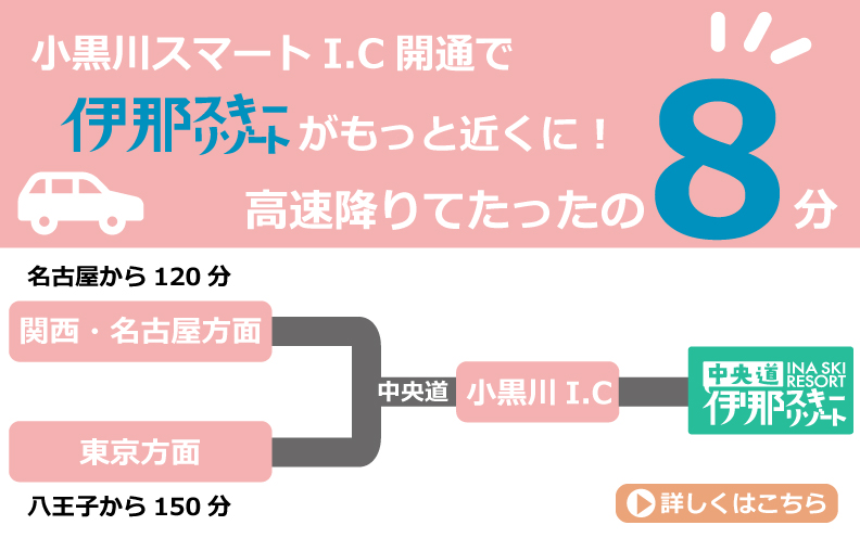 交通手段 | 車 | 中央自動車道 小黒川スマートIC→広域農道→小出3区交差点右折→スキー場8分 6km 中央自動車道 伊那IC→広域農道→小出3区交差点右折→スキー場15分 11km 中央自動車道 駒ヶ根IC→広域農道→小出3区交差点左折→スキー場15分 12km 積雪情報はこちら |