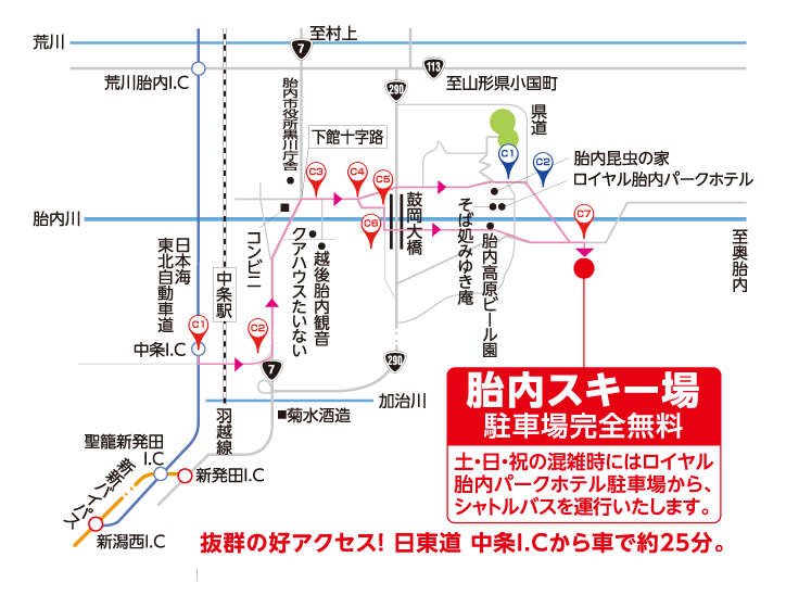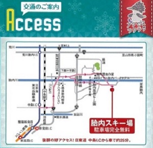 胎内スキー場 住所 〒959-2823 新潟県胎内市熱田坂881-166 TEL 0254-48-3002 FAX 0254-48-3842 |
