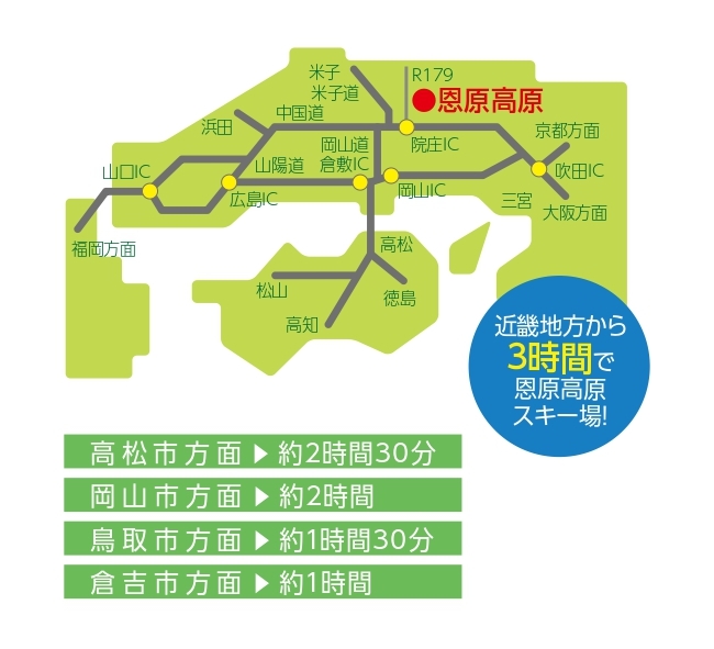 恩原高原スキー場 住所 〒708-0601 岡山県苫田郡鏡野町上齋原2037 TEL 0868-44-2808 FAX 0868-44-2361 |