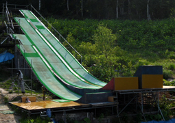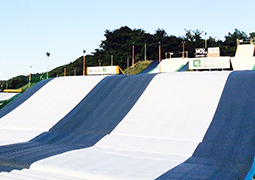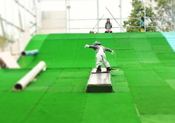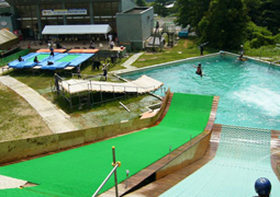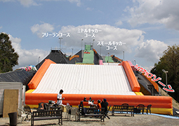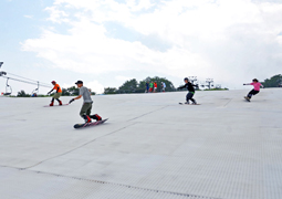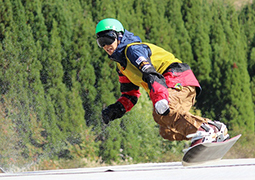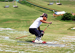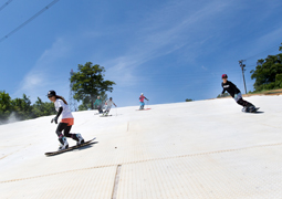 サマーゲレンデ、スノーマットと呼ばれる特殊なマットをゲレンデに敷き、滑りをメインにトレーニングができる施設。オフシーズンでも雪上に限りなく近い感覚でスキーやスノーボードの練習が可能。初めてチャレンジする場合はサマーゲレンデ専用の板をレンタルするのがオススメ。また、転倒時に怪我をする恐れがあるので、半袖や半ズボンなどの肌の露出が多い服装は基本的にNG。慣れない間はヒジやヒザのプロテクターも用意しておこう。