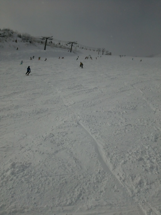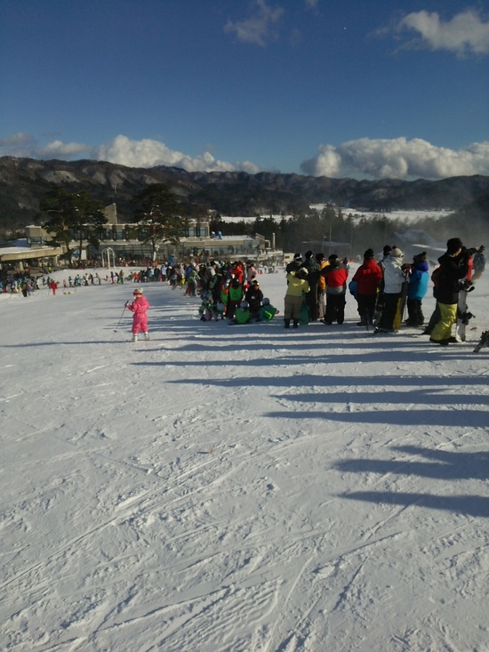 強風でゴンドラが運行停止。お陰で、遠見ゲレンデが激混みに。リフト待ちの列が100メートル以上に。雪も少なく所々土とブッシュが見えてました。