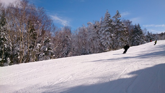 土曜日まで降り続いた雪も前日の日曜日には止み、当日の月曜日は晴天!風も無風で頂上付近の気温は1度でしたが、春スキーのような陽気にビックリ。絶景の眺めを堪能できて幸せでした。さてゲレンデはと言うと残念ながら木落のオープンにはまだまだ積雪が足りず、ゴンドラで最頂部まで上がり、約1.4キロ程の初級~中級コースを10本程滑って来ました。天気に恵まれ気持ち良く初滑りが出来たので、取り合えず満足です。