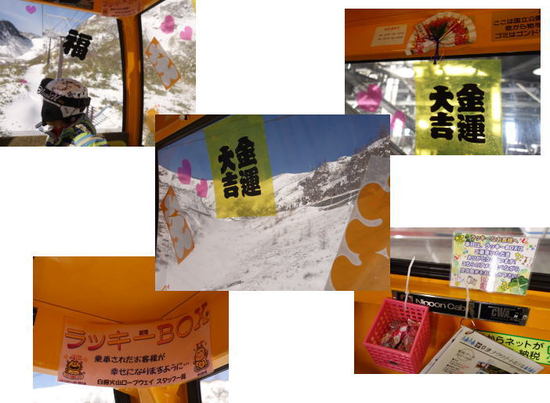 正月休みを利用して草津国際へ!とにかく縦に距離があるスキー場なので、雪不足だった去年はゲレンデ下部はハゲハゲでも、山頂はパフパフキュキュッ!! 今年はたっぷりの雪と最高の雪質、そしてお正月休みでもゲレンデが広い為、混雑した感じがなくて滑りやすいところが気に入っています。 今年は、ラッキーゴンドラにちょうど乗れて、新年早々縁起が良くてHAPPYな気分になれました♪ ラッキーゴンドラ内には、飴玉や絨毯に座布団など、樹氷と青い空を眺めならが快適に過ごせました☆彡