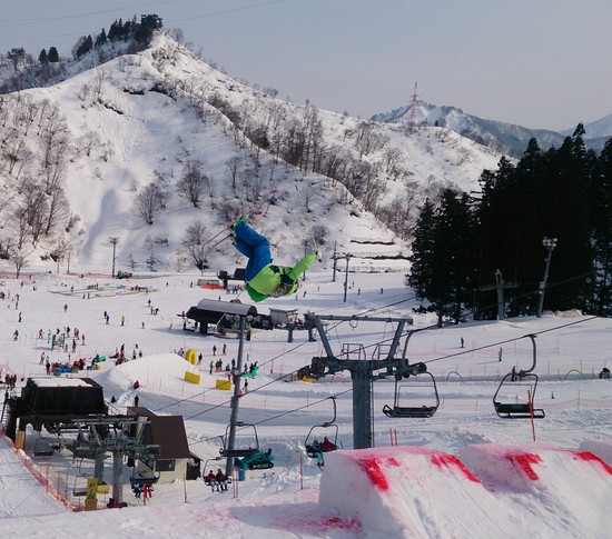 モーグルの大会をやっていて、迫力満点の滑りを間近でみることができました。