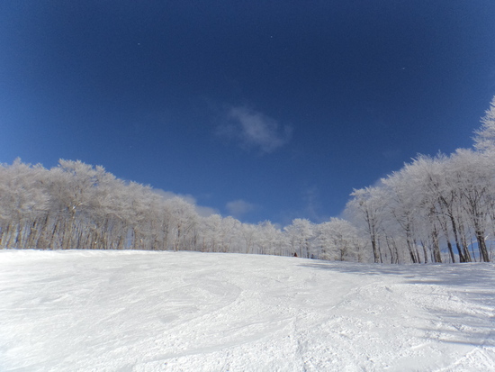 この日は平日の好天気、クオリティ高いJAM勝山のゲレンデが空いていて思う存分滑れた1日だった。テンション高めでリフト乗り場に行くと前にいた2人連れの女の子、この日ゲレンデで見た中で私的には「金メダル」だった。青空と樹氷を背景に入れて後姿をパチッと1枚!