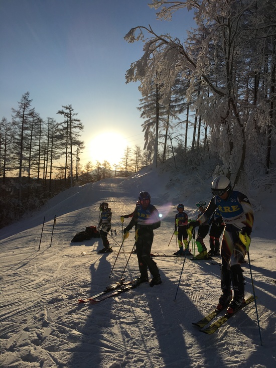 朝7:00リフト営業で日の出がとても綺麗でした 朝日を浴びたトレーニング開始前の選手達 この日の朝も良い練習が出来ました