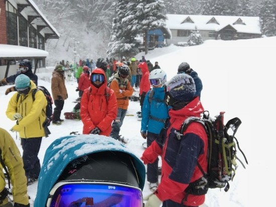 前日がリフトメンテでスキー場自体がクローズだったのと連日の降雪でプレミアムパウダーデー開催でした。ゲレンデの90%を非圧雪というパウダー好きにはたまらないイベントです。気温が低かったので軽い雪で極上の浮遊感を楽しめましたが、平日にも関わらずパウダー好きが集まり、朝イチリフト待ちは50名くらいいたのではないでしょうか!