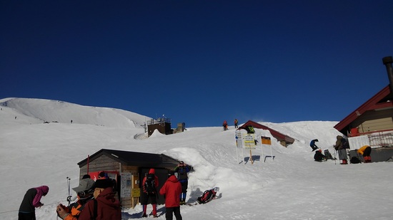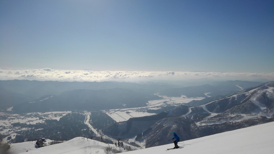 終日青空で気持ち良く滑走できました。平日にもかかわらず多くの人でにぎわいました。目立つのはシニア層、ボードは少なかったです。