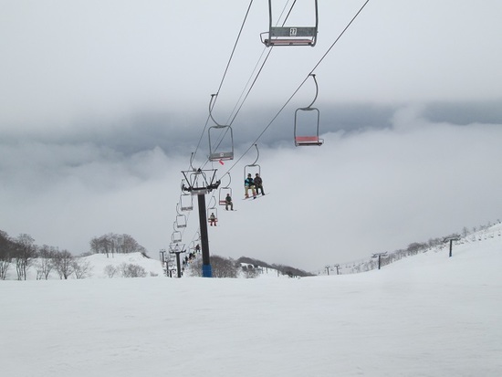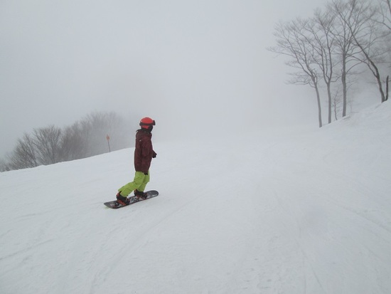 前日と違いこの日は曇り空、アルプス平は雲海に覆われ幻想的な滑走が楽しめました。