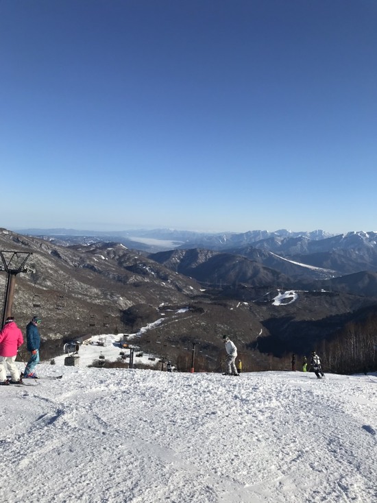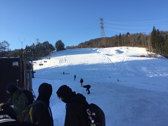 オープン2日目で朝7時過ぎからゴンドラに乗るのに並んでる人々いっぱいでしたが、朝一のゲレンデはそんなに混んでなく良かったですが、雪あったけどまだまだ少なくブッシュと石混じりの所があり板が心配です。