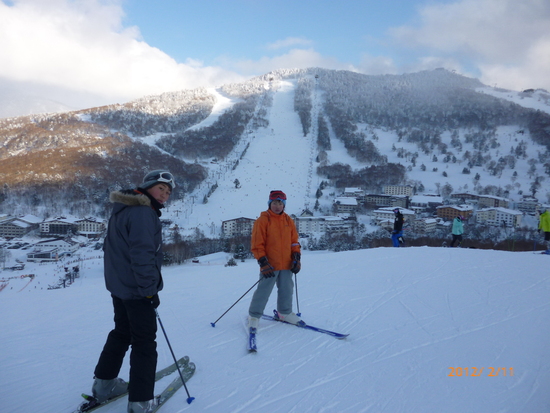 2/11 朝は信州中野ICからチェーン規制の渋滞を知り、小布施PAのスマートICで迂回。ETCだと便利です。駐車場は9時過ぎなので、どこもいっぱい、一ノ瀬ダイヤモンドの外れが空いていたのでそこに停めて滑り始め。