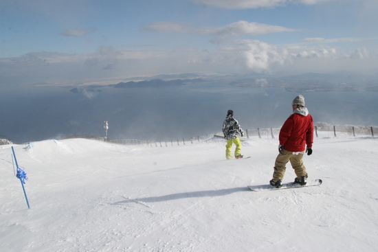 初すべりは、絶好の天気で気持ちよくびわ湖に向かってすべれました。ランチは人気の三色カレー+メガ棒カツ。しっかり滑ってカロリーも消費しましたよw