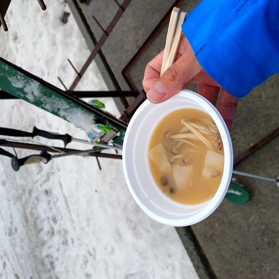北パラダは全コース滑走可能でしたが、ウェアがびしょ濡れで冷えた体に、無料で振舞われたきのこ汁がとてもありがたかったです。