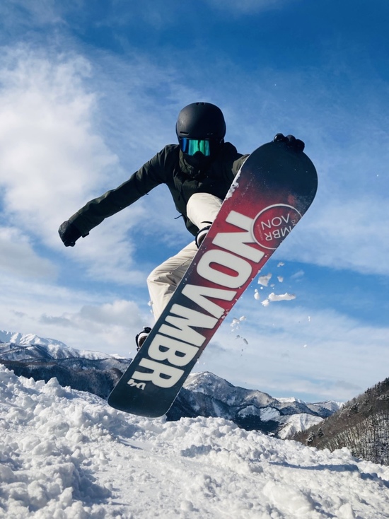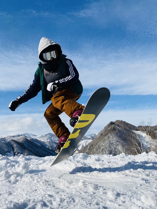 青空と雪山を背景にジャンプ!景色も良く、爽快感があり最高でした!板の裏が見えるように飛ぶのがポイント。もっと高く飛べるようになりたい!来シーズンが待ち遠しいです。