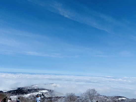 野沢温泉スキー場の頂上からの写真です。一気に滑るぞ!と気合を入れた瞬間のポーズです。一面の青空と雲海、パウダースノーで、最高のコンディションでした!