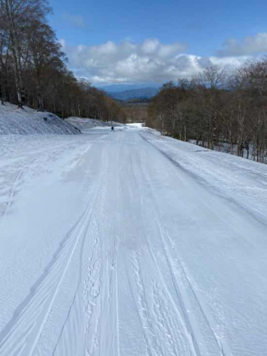 前夜から早朝まで少し雪が降ったのでゲレンデにもうっすらと新雪が積もってました。場所によってはブレーキ雪となりましたが板掴みって程ではないので時期的には良いコンディションでした。