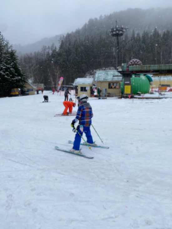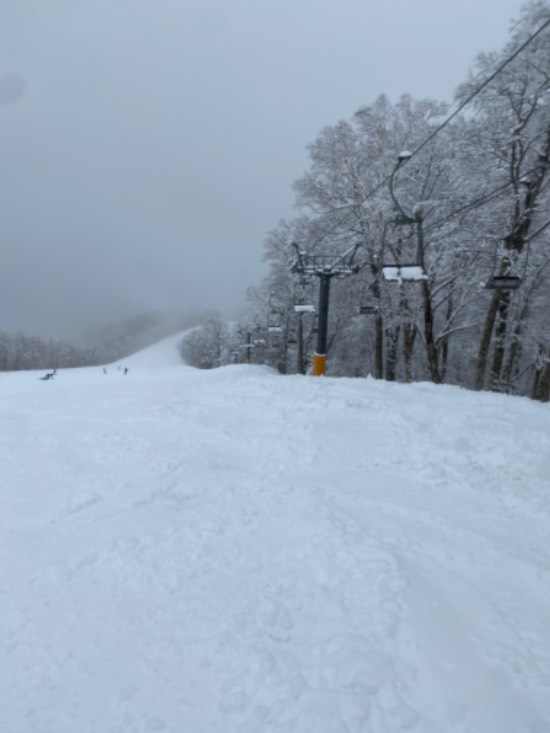 水分が多めな雪が降りしきる中での滑走となり山頂の一部では視界不良な箇所もありましたが、国体女子沢コースはゲレンデコンディションが良くなかったもののミルキーウェイ上部や西山ゲレンデの各コースは板の走りもよく麓のコースとの違いを存分に感じました。