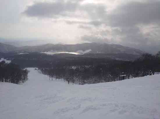 雲の隙間から太陽が見えて幻想的な景色を見ることができた。 自然を十分に感じられるスキー場です。 滑走しながら湖を見ることもでき、景観もよいです。