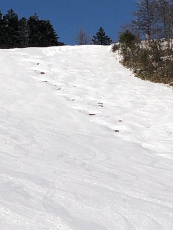 あまりに天気が良く、気温も高い為、天狗ゲレンデ上部のコブは穴が開きブッシュが出てしまいました 圧雪エリアは全く問題ありません