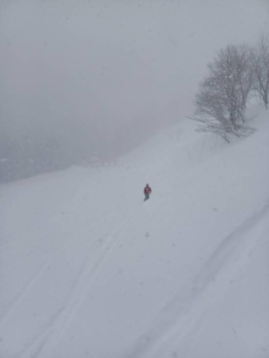 朝は視界良好でしたが、リフト開始すぐにゴン降りで視界不良! 30㎝程のパウダー天国でした。100人くらい並んでたww