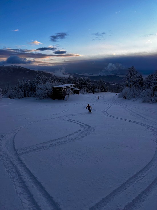ゴンドラ上から日の出を拝みながら滑れるし、今回は太陽柱が見れた。雲海もみれる。