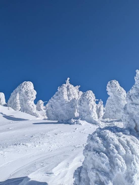 前夜からまとまった降雪があり、ゲレンデコンディションは良好。樹氷も綺麗な状態で観賞できた。