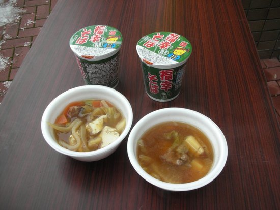 お酒、いのしし汁、カップそばのサービスをありがたくいただきました。