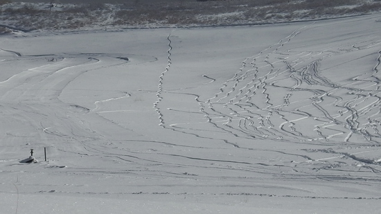 必要最低限しか圧雪してなくて(しかもひどい品質で)残りは一面の未圧雪ゾーンとなっていました。しかし上部はハイシーズンには一大パークとなるので、この時期限定かも知れません。
